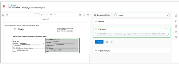 - Automatically identifies and captures signatory details such as names, designations, companies, and dates, even when elements are closely positioned.